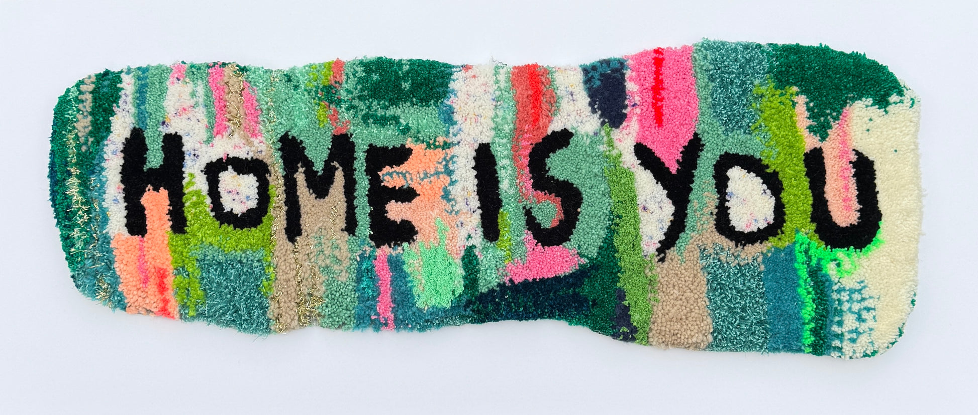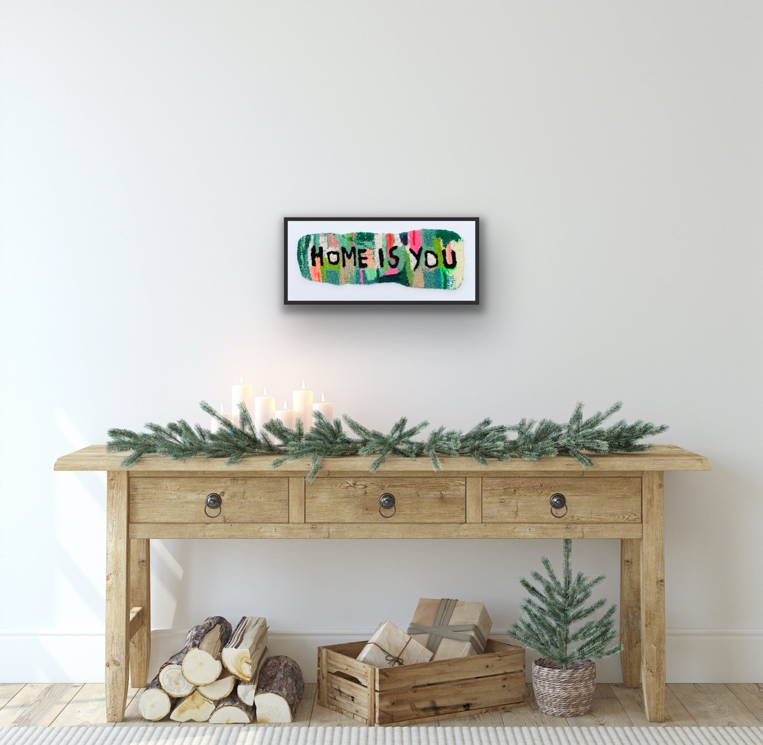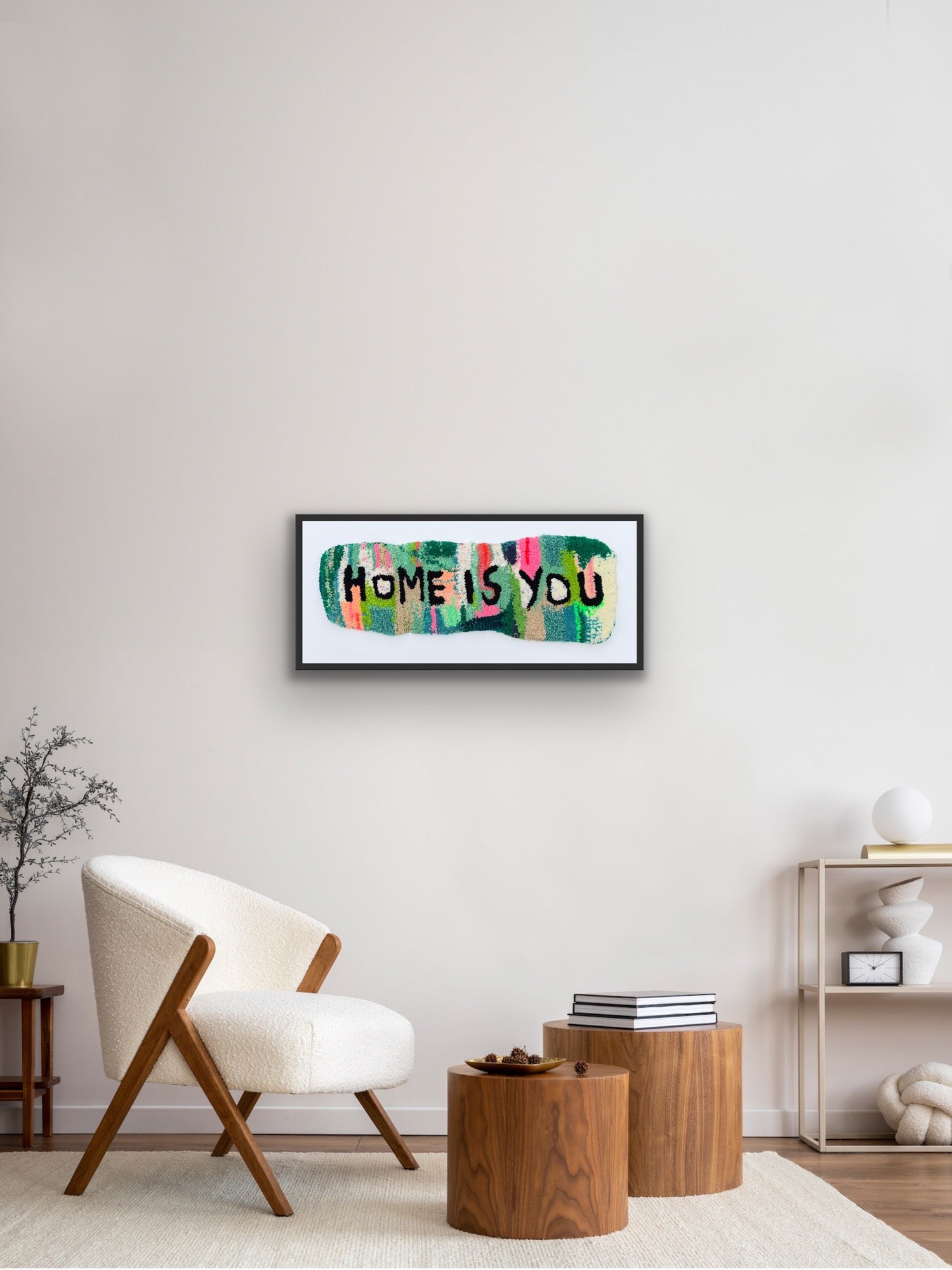Lad kunst flytte ind i hverdagen. “Home is you” er en unikt håndlavet tuft, indrammet i sort træramme og beskyttet af museumsglas, der sikrer både dybde, klarhed og lang holdbarhed.