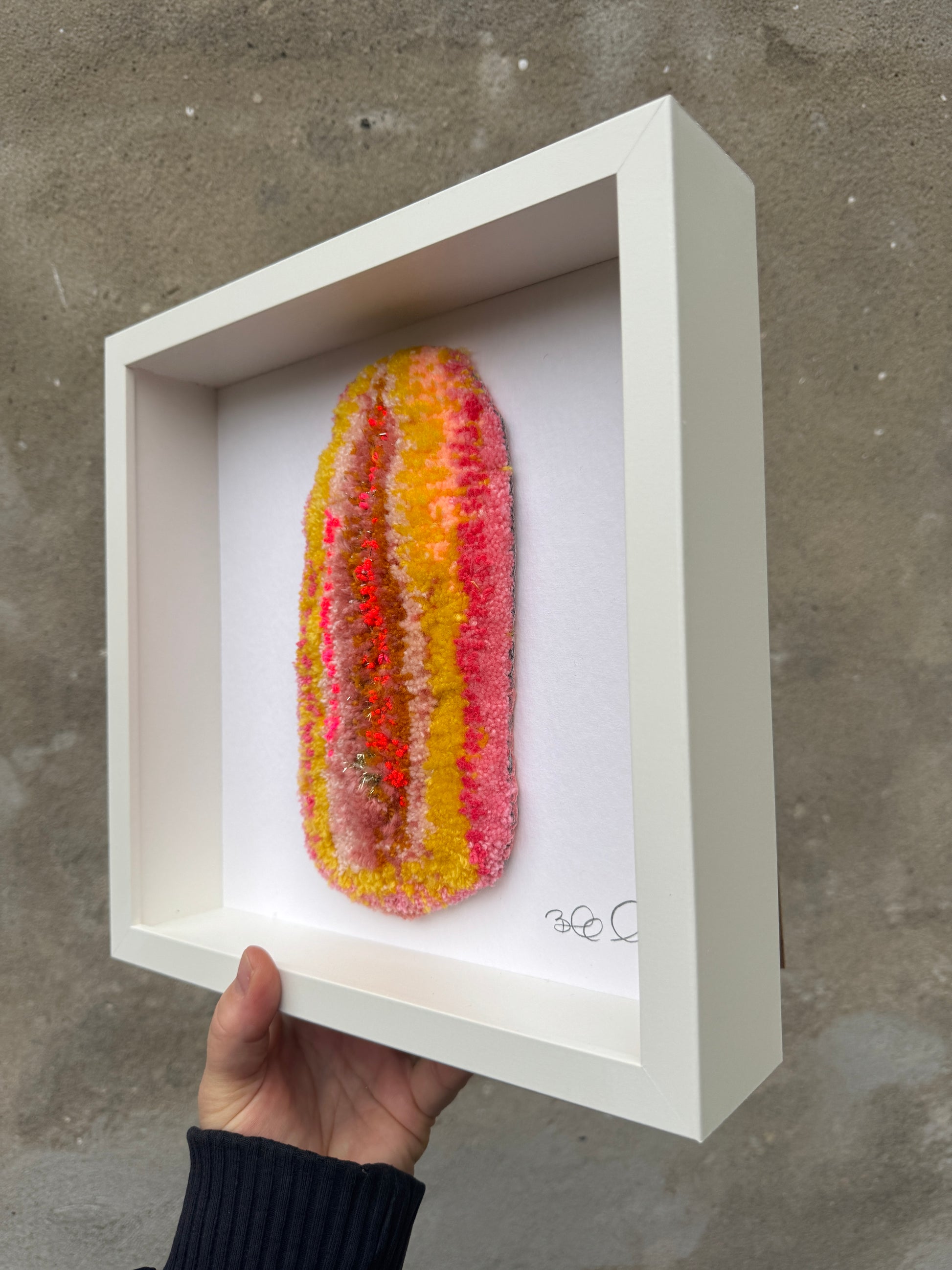 Oplev denne tuft i harmoniske, smukke farver,med masser af glimmer✨ skabt som et enkeltstående kunstværk. Værket er monteret i en dyb, hvid træramme og beskyttet af eksklusivt museumsglas, som fremhæver teksturen og farvedybden.