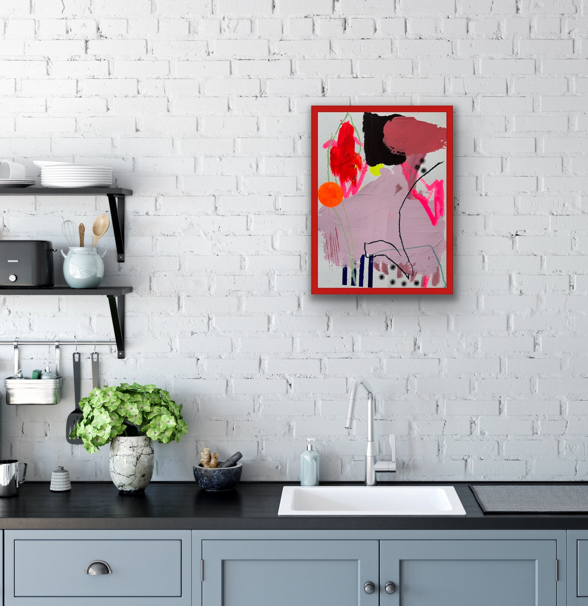 Et vibrant og karakterfuldt kunstværk, der tilfører personlighed, varme og kant til enhver bolig.