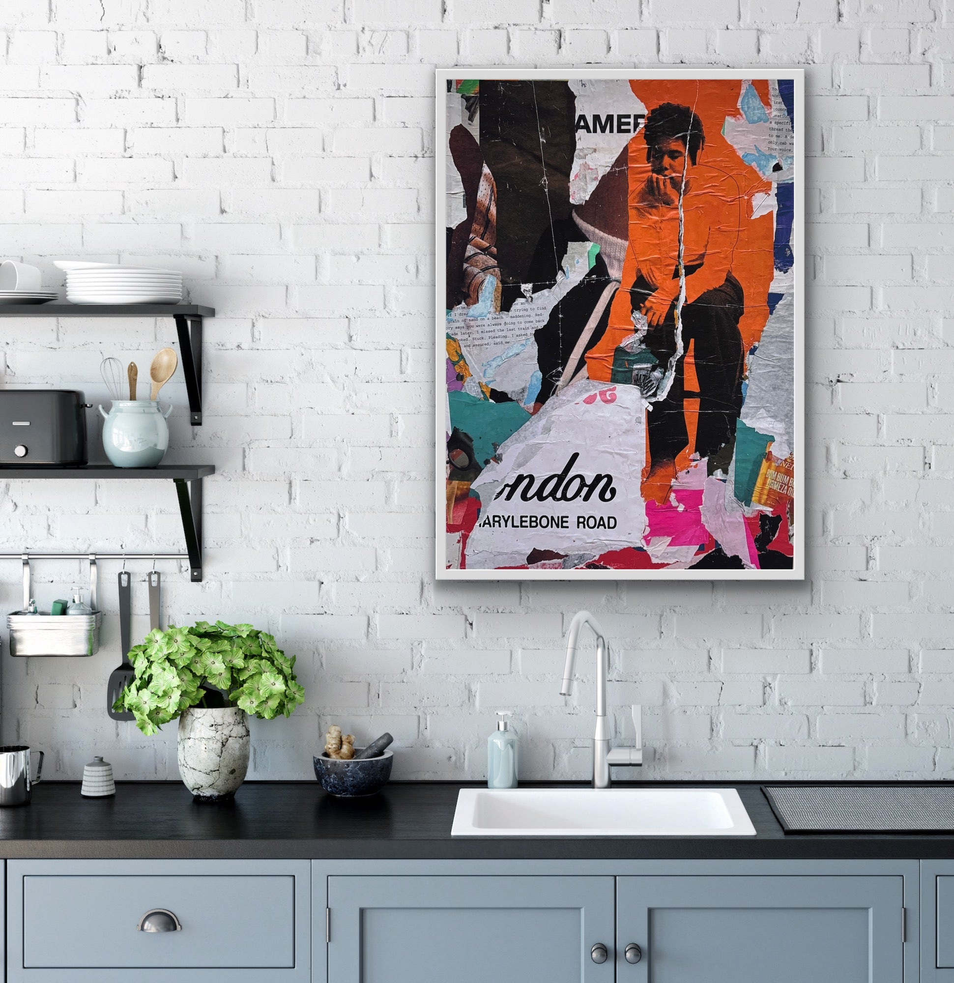 Unikt motiv sammensat af plakater og visuelle fragmenter indsamlet i SOHO, London. Et levende udtryk, hvor lag på lag af byens visuelle stemning danner et råt og kunstnerisk udtryk.